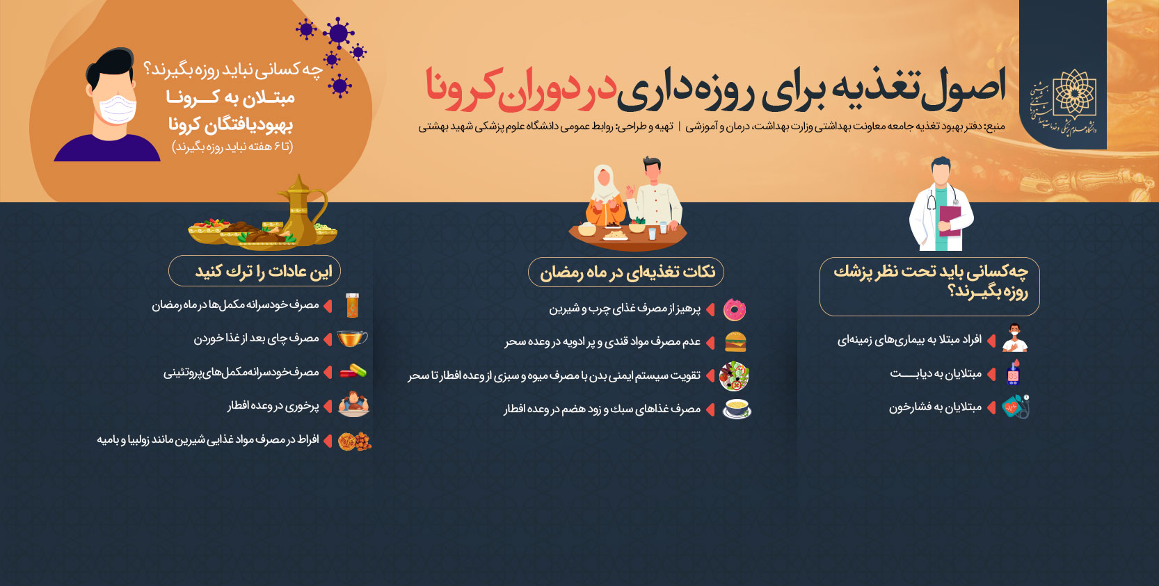 به گزارش روابط عمومی دانشگاه علوم پزشکی شهیدبهشتی، بنا بر توصیه های دفتر بهبود تغذیه معاونت بهداشتی وزارت درمان و آموزش پزشکی یک دسته از افراد سالم هستند و دچار ویروس کرونا نشدهاند که این افراد در این شرایط هم میتوانند روزه بگیرند، اما به شرطی که اصول تغذیهای خود را رعایت کنند. یعنی باید حتما وعده سحری را بخورند و در وعده سحری و افطاری، نکات تغذیهای را رعایت کنند. همچنین از افطاری تا سحری، میوه و مایعات مصرف کنند.